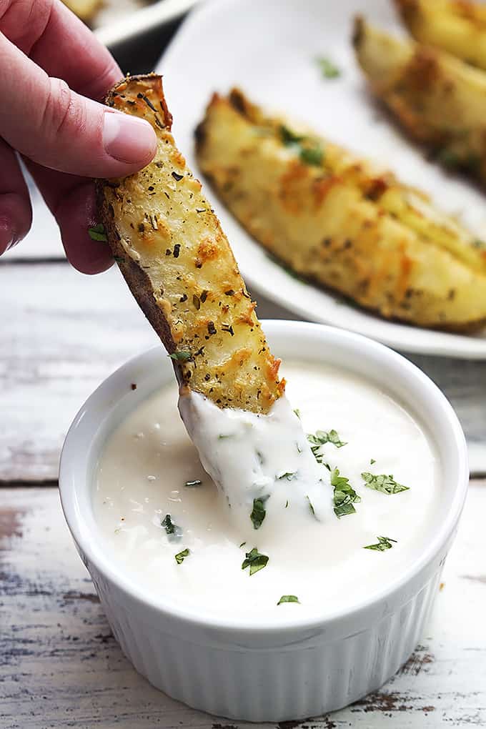 - Place potato wedges on prepared baking sheet in a single layer with skin-sides-down. Bake for 25-35 minutes until potatoes are fork-tender and golden. Sprinkle with freshly chopped parsley and dressing for dipping.